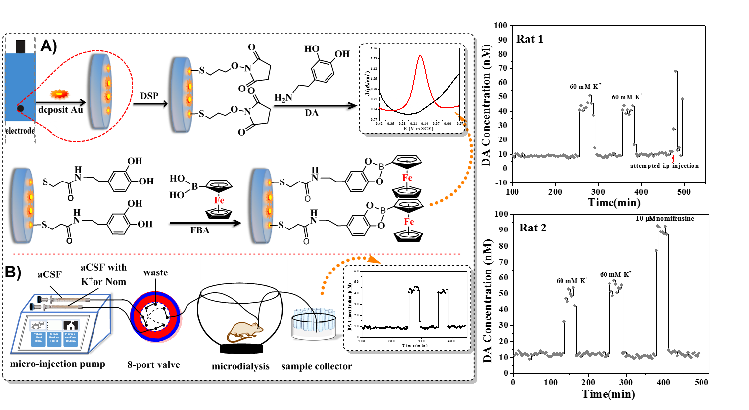 高灵敏高选择性的检测活体脑内多巴胺(DA)的水平对评价DA在生理病理发生过程中的作用具有重要价值。特别是由于神经传递涉及到快速事件,降低DA的检测间隔更好地获取DA水平的动力学变化给DA分析方法的开发带来了巨大的挑战。本研究基于双分子识别开发了一种灵敏的电化员工物传感器用于DA的选择性检测。在该传感器的构筑过程中,分别利用硼酸和N-羟基丁二胺酯胺分子特异性地与DA上邻二酚羟基和脂肪氨基发生键合从而达到选择性识别DA的目的,且硼酸分子上修饰有二茂铁基团,同时达到电化学信号输出的目的。更重要的是,该传感器检测活体脑透析样品时,仅需要7μL,可实现每4分钟检测一个脑透析液中的DA浓度。随后,利用该生物传感器成功地用于检测活体受高浓度K+和诺米芬辛刺激过程中的大脑中DA水平的动力学变化。
