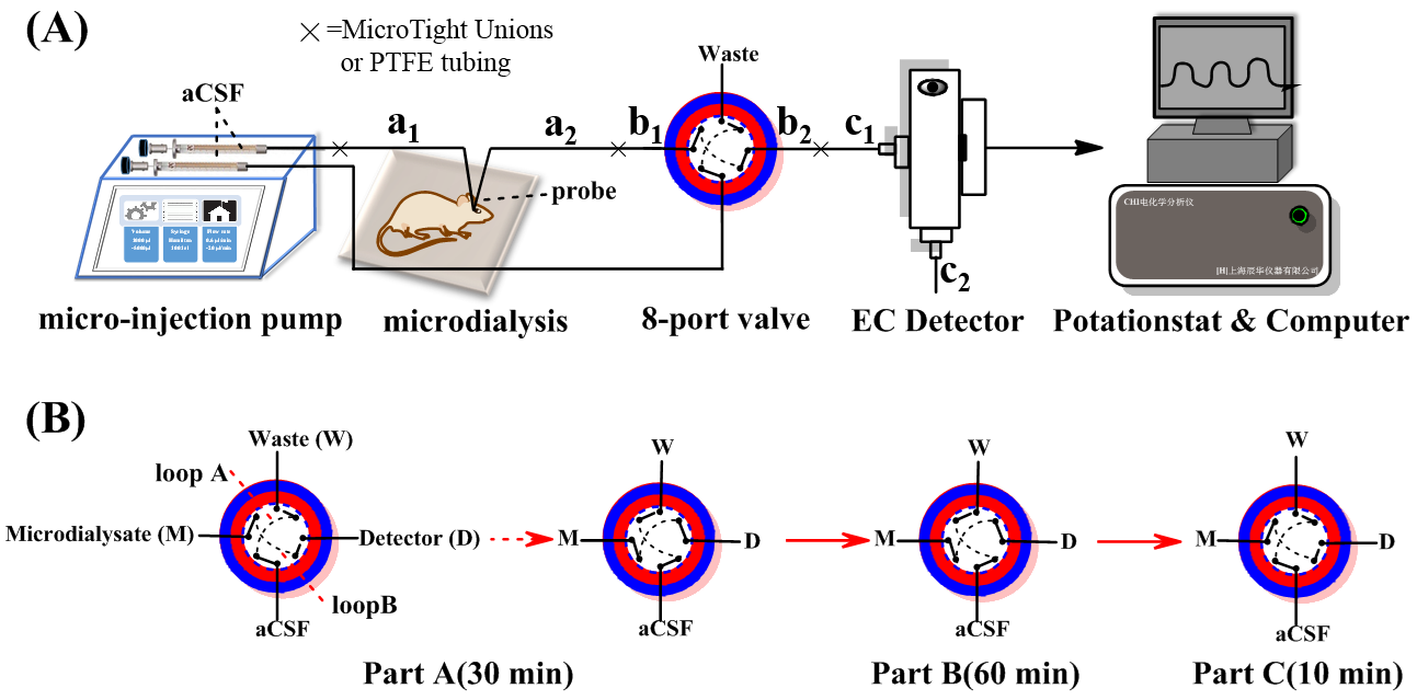Fig. 1. (A) Schematic illustration of the present on-line electroanalytical system for in vivo analysis; Flow path: syinge-a1-probe- a2-b1-valve-loop-b2-c1-detector-c2; Tubing: a1 and a2 (20 cm long; 75 μm i.d., 150 μm o.d.), b1 and b2 (5 cm long; 75 μm i.d., 365 μm o.d.), c1 and c2 (5 cm long; 50 μm i.d.,365 μm o.d.). (B) The stages of the 8-port valve in the continuous monitoring of cerebral glucose in vivo following global ischemic/reperfusion events; Part A (30 min): injection of one loop aCSF; Part B (60 min): global cerebral ischemia/reperfusion events; Part C (10 min): injection of one loop aCSF. (C) The comparison of updated system and old system.