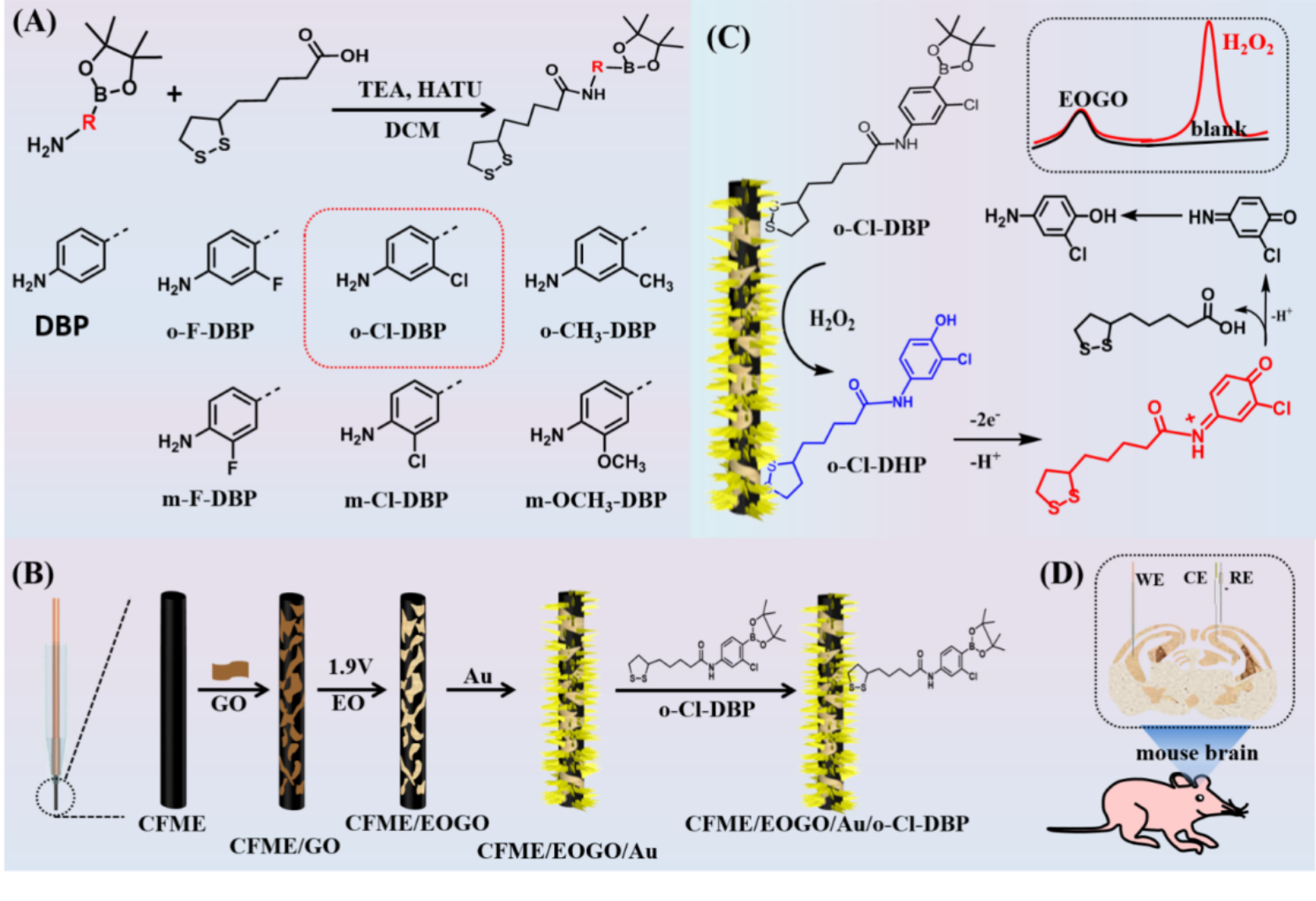 过氧化氢(H2O2)是活体中最丰富、最稳定的活性氧(ROS)之一,作为多巴胺信号的调制器,与帕金森病(PD)密切相关,因此,实现活体脑中H2O2的选择性检测对于研究相关脑疾病的发生与发展至关重要。为此,本研究通过设计一系列DBP衍生物作为电化学探针分子,与H2O2特异性反应,根据反应产物DHP衍生物的电化学信号对H2O2实现高选择性检测。在所设计的系列DBP衍生物电化学探针分子中,o-Cl-DBP与H2O2反应时间最短,反应产物o-Cl-DHP表现出更高的电流密度且更负的氧化电位,这说明其对H2O2检测的性能最佳。此外,在碳纤维丝微电极(CFME)上修饰了电化学氧化石墨烯(EOGO)作为基底材料,不仅可使H2O2检测的灵敏度显著提高,而且可提供稳定的内参比信号,避免环境因素的干扰。以此构建的H2O2比率型电化学微传感器具有灵敏度高、选择性好、重现性好等优势。最终,该电化学微传感器成功地应用于PD小鼠脑中不同亚区H2O2的监测。同时,该工作表明,与正常小鼠相比,PD小鼠中不同脑区的H2O2和抗坏血酸(AA)表现出动态变化,表明H2O2和AA的平衡可能在PD的发生与发展中发挥着重要的作用。