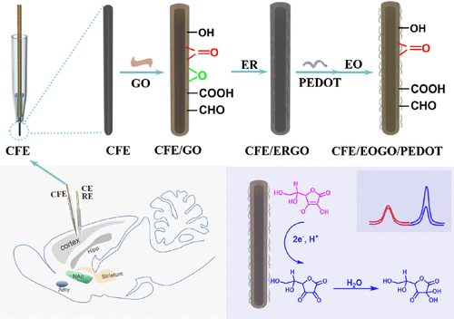 抗坏血酸(AA)是中枢神经系统(CNS)的主要抗氧化剂,参与抗氧化应激,在帕金森病(PD)的发病机制中发挥重要作用,探索AA在PD过程中的干扰对了解PD的分子机制具有重要价值。在此,本研究利用碳纤维电极(CFE)作为基质电极,设计了三步电化学过程合理地裁剪石墨烯表面的含氧基团的:1)恒电位沉积氧化石墨烯于CFE表面;2)电化学还原去除环氧官能团加速AA电氧化过程中的电子转移动力学;3)电化学氧化产生羰基(C═O),生成一内参比信号。同时我们利用基于密度泛函理论(DFT)的分子模拟计算了AA在石墨烯缺陷模型表面不同氧基官能团(羧基、羟基、环氧基和羰基)对AA的吸收,验证了以下现象:环氧基团会阻碍AA在石墨烯上的物理吸收,而其他官能团则有利于AA在石墨烯上的物理吸收。进一步合理组装生物相容性聚乙烯二氧噻吩(PEDOT)以提高石墨烯在活体分析中的抗生物污染性能。建立了一种灵敏度高、选择性好、重现性好的AA比率型电化学微传感新平台。用该方法测定正常及亚急性PD小鼠不同脑区的基底水平,结果表明亚急性PD小鼠海马和皮质中AA水平明显低于正常小鼠,说明AA参与了MPTP诱导的神经毒性过程。