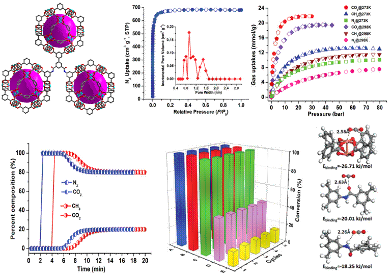金属有机框架材料(Metal-Organic Frameworks,MOFs)由于具有极高的比表面积和孔体积,且其孔结构和表面性质均可设计和修饰,在温室气体CO2的捕获存储分离、高附加值催化转化等方面具有诱人的广泛应用前景。使材料兼具高孔隙率、优良稳定性和理想框架-CO2分子相互作用,是设计合成新型高性能CO2吸附与催化转化MOF材料的一个有效策略。