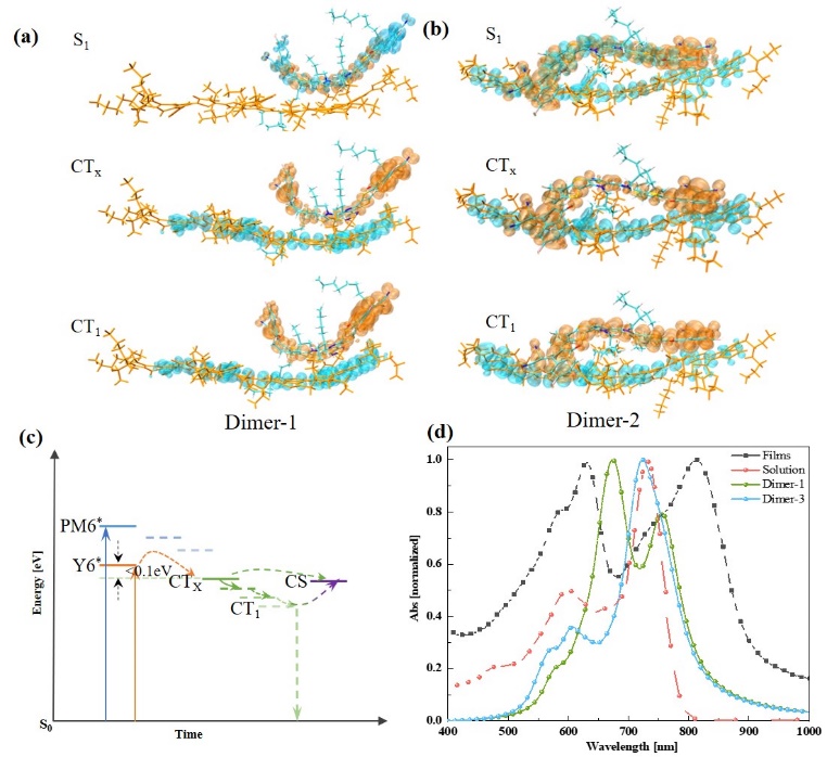 图2(a)(b)二聚体S1态、CTX态和CT1态的空穴-电子(蓝-橙)密度分布(c)PM6:Y6二聚体的电荷转移过程(d)PM6:Y6薄膜和二聚体的紫外-可见光谱。
