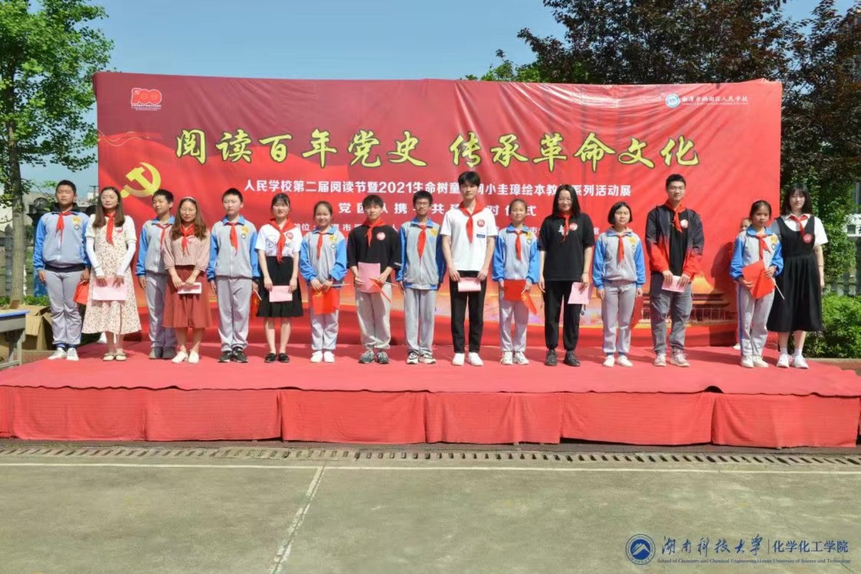 活动开始,在结对小朋友为志愿者们系上红领巾后,大家一起在操场集合。首先,赵秀飞老师进行了发言,她强调了公司志愿者们应树立好榜样,鼓励和引导人民小学的同学把党的精神传承与发扬下去。接着,志愿者代表张雄上台庄重发言并带领大家进行了宣誓。接着结对小员工与志愿者们互换了结对卡并拍照留念。最后,全体师生以合唱《没有共产党就没有新中国》至此,活动圆满结束。