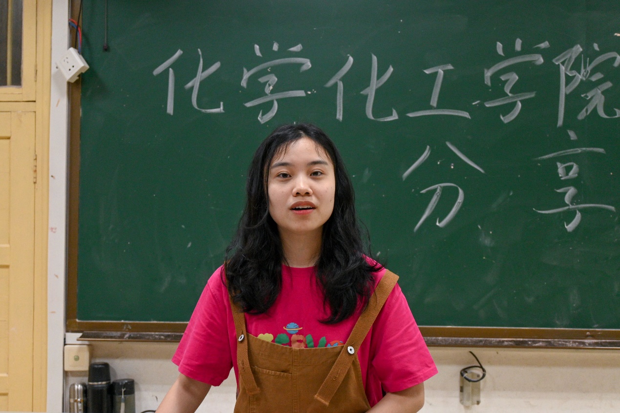 “星光不问赶路人,时光不负有心人。”应用化学专业的王央同学在分享中提到大一时担任了班干和员工会干事对她有重要影响,丰富的任职经验也使她在今天的分享会上更加从容。关于学习方法,她指出课堂上要认真听课,课堂之余找到适合自己的方法,多留意真题,认真完成老师布置的题目。最后,她鼓舞同学们充分发挥自己的潜力,在老员工活中持续发光。