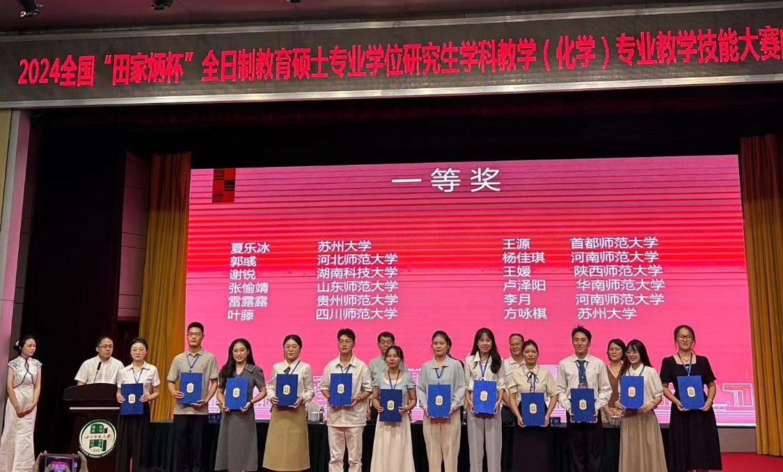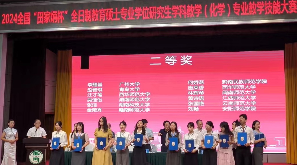2024年9月8日,2024年全国“田家炳杯“全日制教育硕士学科教学(化学)专业学位研究生教学技能大赛在四川师范大学顺利落幕,304永利集团本次入围决赛的两名选手全部获奖。其中,2022级谢锐同学获得大赛一等奖、2023级张洁同学获得大赛二等奖。这是公司研究生参加该赛事以来的最高获奖也是获奖人数最多的一次。