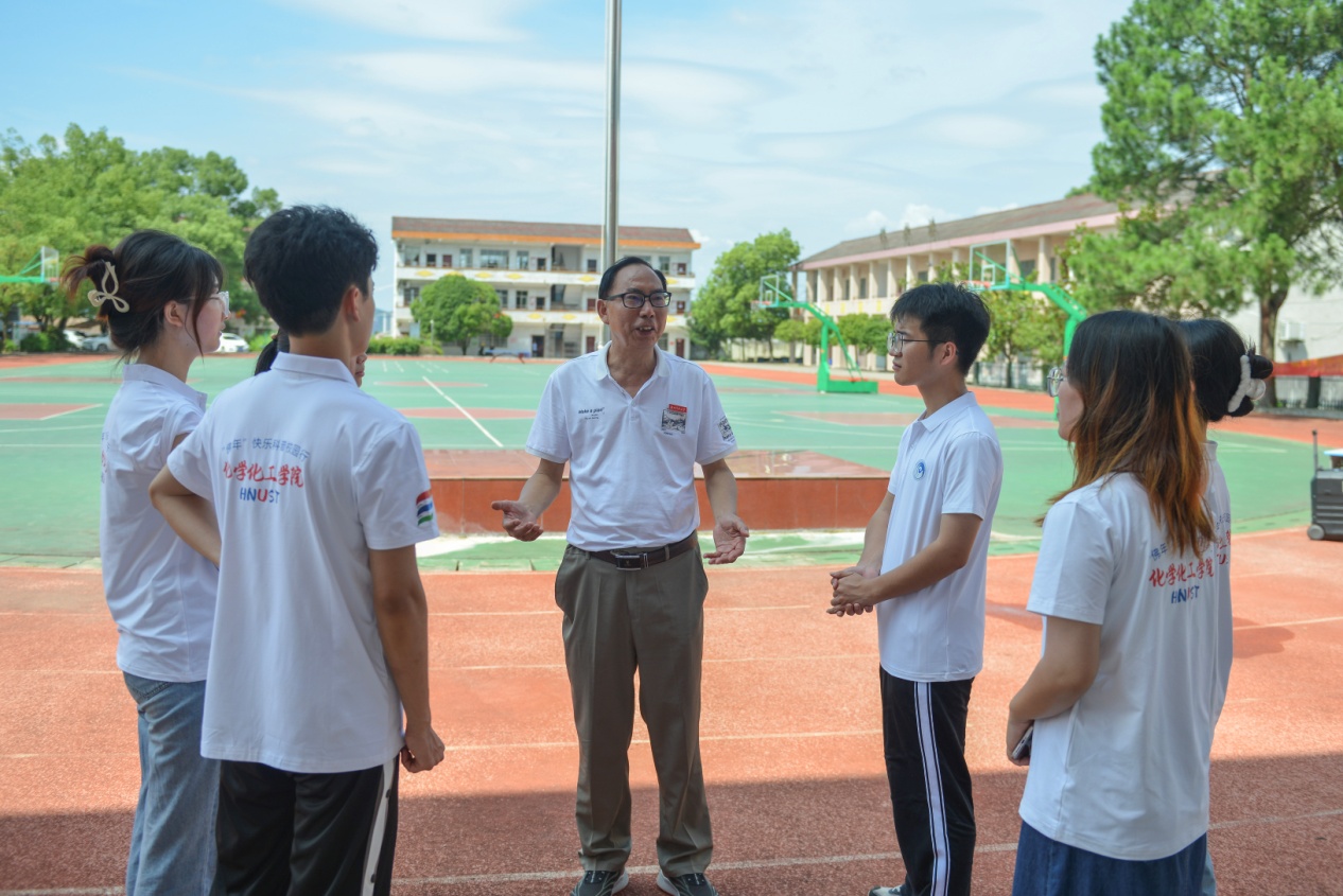 夏日炎炎,火轮高吐。304永利集团“佛年”快乐科普校园行“三下乡”暑期社会实践团队来到醴陵市东堡中学,为该校员工开展趣味课堂科普活动,激发孩子们对化学的兴趣,提高化学学科素养。为帮助志愿者提升教学素养,保证活动顺利展开,7月3日至6日,304永利集团老年科协秘书长、关工委副主任李建生老师迎着骄阳两次看望团队的志愿者们,在课堂讲授、员工心理、社会调查等方面给予指导。