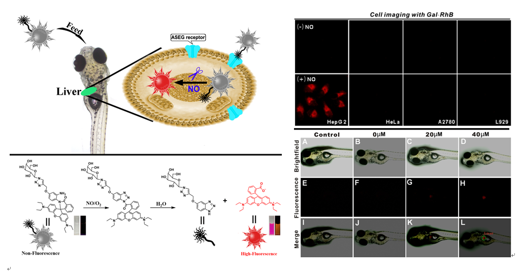 近日,304永利集团理论有机化学与功能分子教育部重点实验室的张培盛博士研究团队首次报道了一种肝靶向NO荧光探针(Gal-RhB),实现了斑马鱼内肝脏中NO的原位成像检测。Gal-RhB以市售罗丹明B为母体结构,通过将邻苯二胺(NO识别基团)和半乳糖(肝靶向基团)引入罗丹明B结构中,构建了肝靶向NO荧光探针(Gal-RhB)。半乳糖基团的引入不仅增加了探针的水溶性,也有利于探针被肝细胞特异性摄取。细胞和活体成像研究表明:该荧光探针(Gal-RhB)能够被肝细胞特异性摄取,并应用于肝细胞和肝脏中NO的荧光成像分析。该研究对进一步了解NO与肝脏相关疾病的发生发展作用研究具有重要的意义。