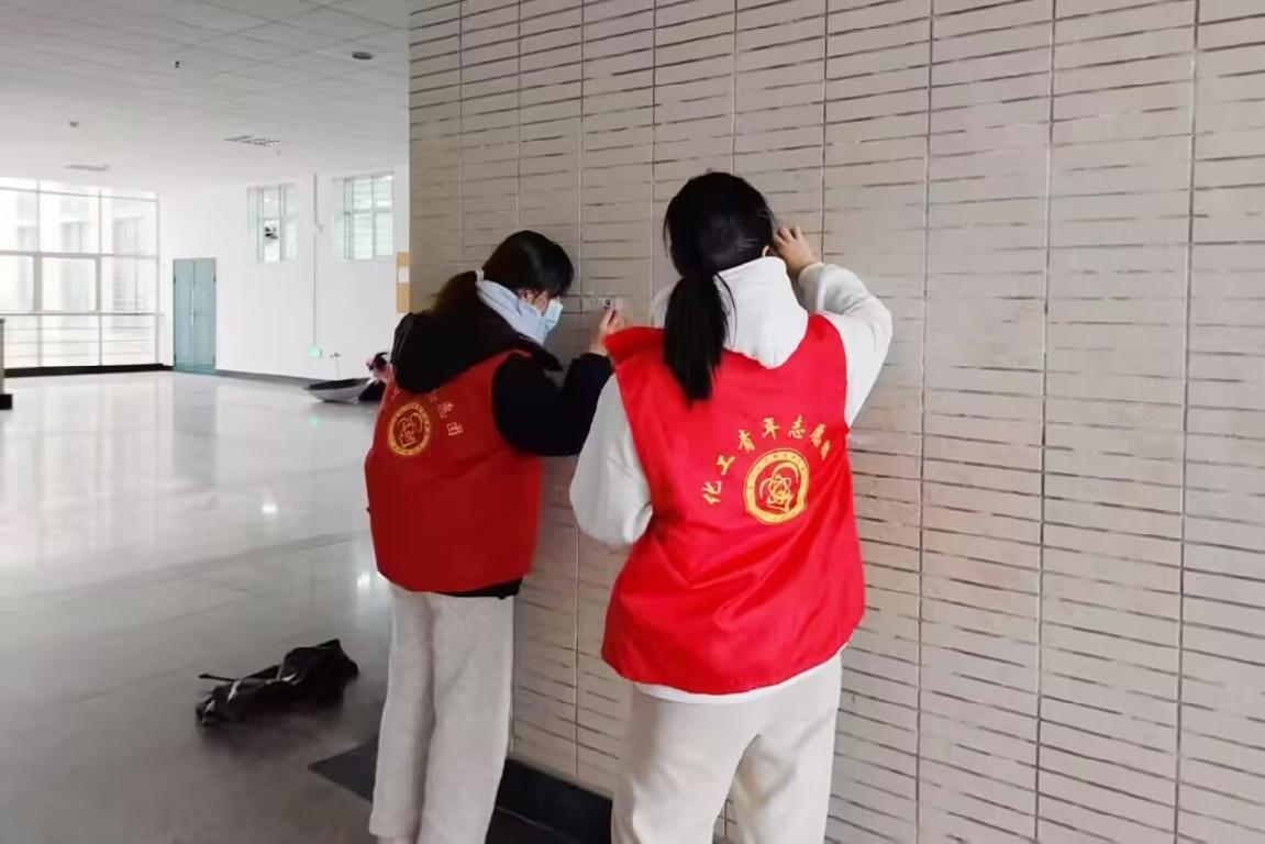 活动中,志愿者们重点清理了第八教学楼的走廊卫生和墙面广告纸及过期占教通知。大家分工协作,手持扫帚、抹布、铲刀等工具,细致清扫地面杂物,擦拭扶手栏杆,并逐一清除墙面张贴的过期广告和顽固污渍。经过近两小时的共同努力,教学楼走廊焕然一新,墙面恢复整洁,整体环境得到显著改善。